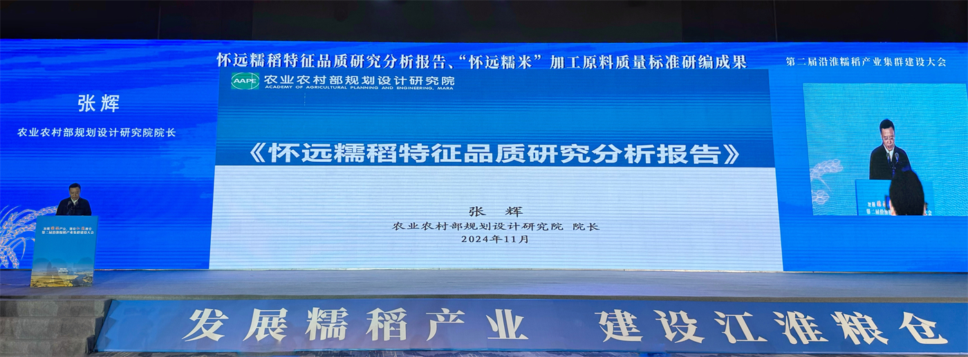 1110日,第二屆沿淮糯稻產業集群建設大會在安徽省蚌埠市懷遠縣召開我院張輝院長受邀參會并作《懷遠糯稻特征品質研究分析報告》成果發布。安徽省農業農村廳廳長汪學軍、蚌埠市人民政府市長馬軍到會致辭,來自安徽、黑龍江、河南等省份的糯稻(稻米)產業相關科研院所、高等院校、龍頭企業和合作社代表等共200余人參加大會。